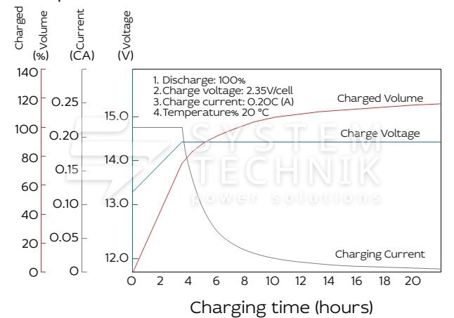 - Рекомендуемое напряжение заряда в циклическом режиме для 12В батареи: 13,5В-14,1В при 25ºС;